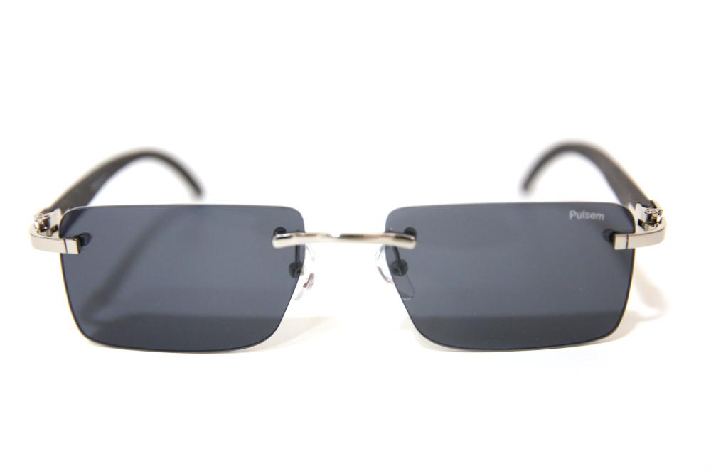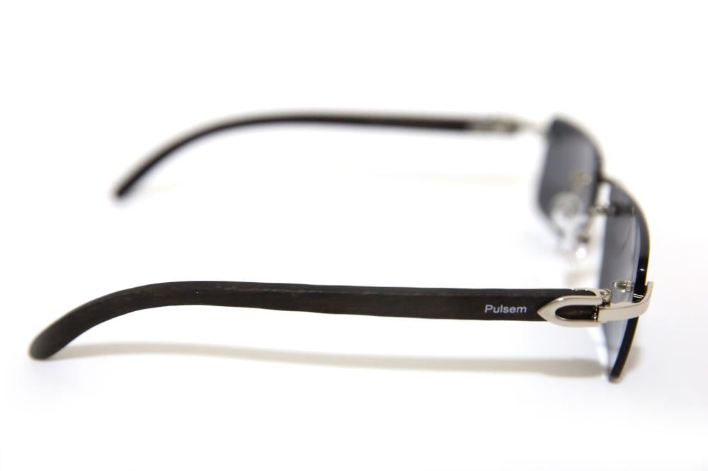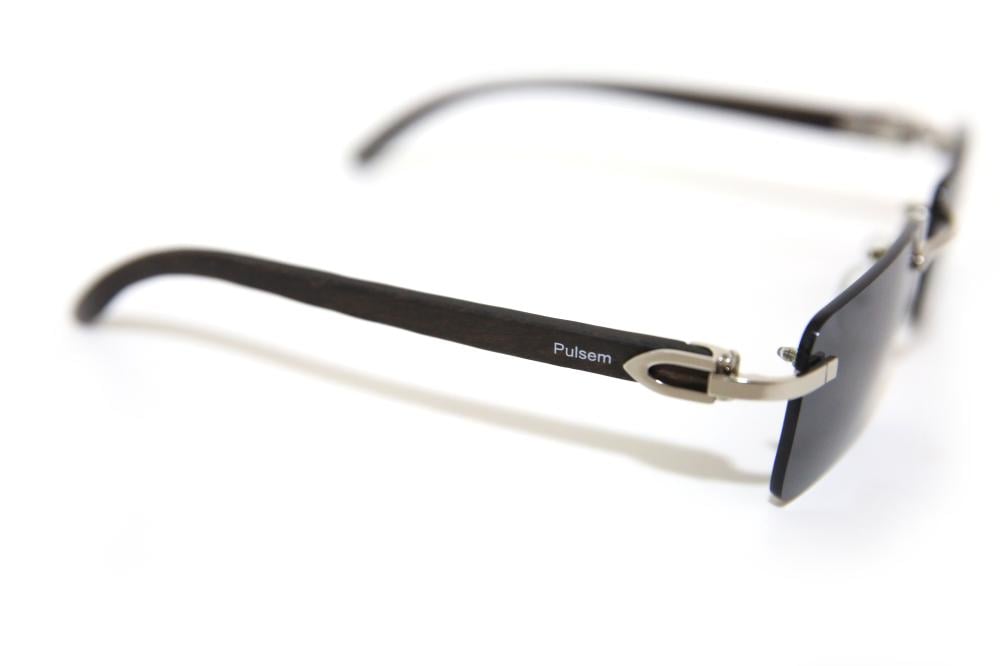 نظارة مميزة من نظارات الهنوف بدون إطار تتميز بتصميمها الأنيق والعصري، حيث تظهر العدسات السوداء بوضوح دون إطار يحيط بها وذراع خشبي يضيف لمسة دافئة وطبيعية.